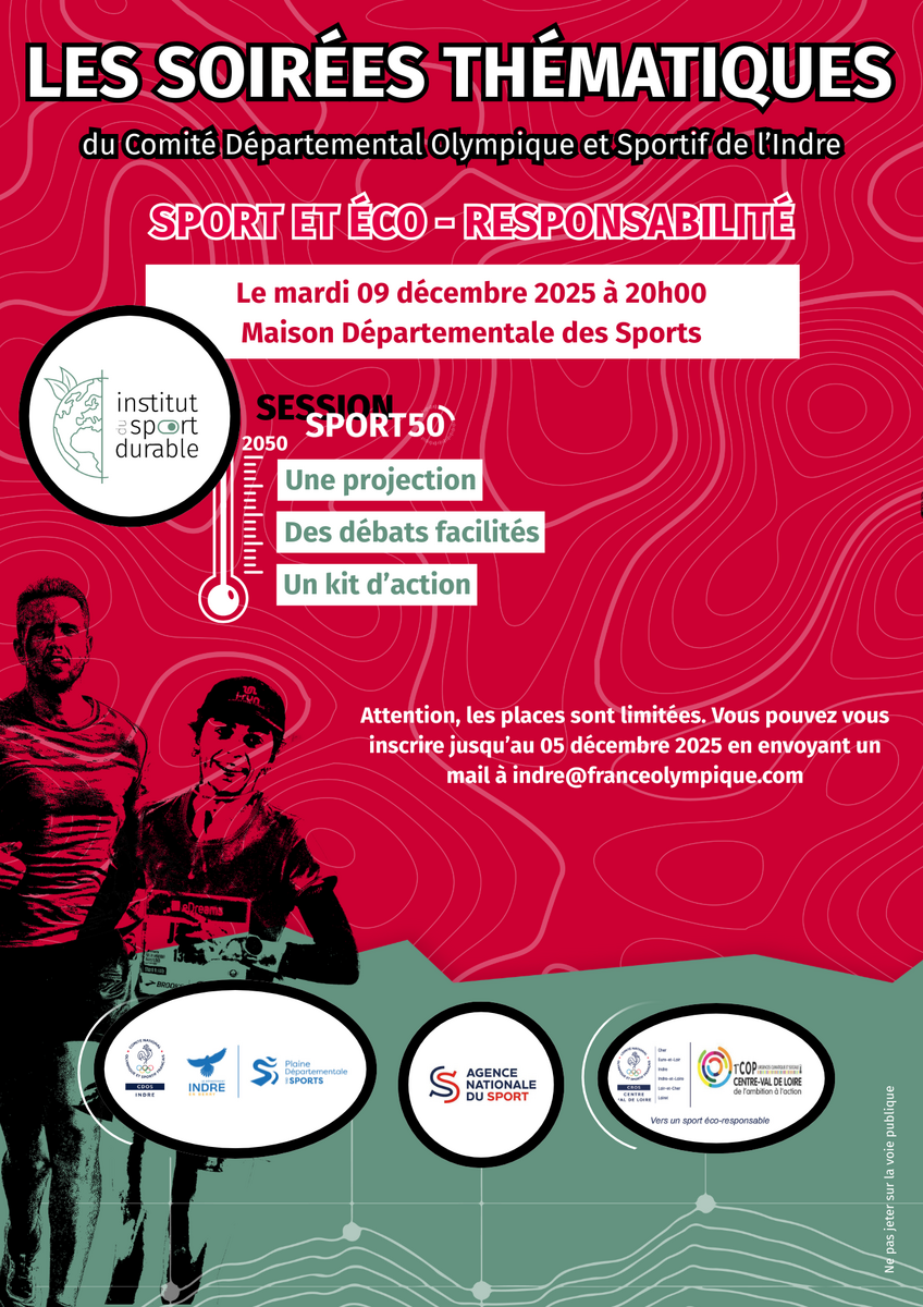 Pour la dernière soirée thématique de l'année, qui se déroulera le mardi 09 décembre à 20h00 à la Maison Départementale des Sports, le Comité a décidé de se concentrer sur l'éco-responsabilité dans le domaine du sport. Cette soirée sera animée par l'Institut du Sport Durable, un acteur clé dans ce secteur. Les participants auront l'occasion d'assister à la diffusion d'un reportage, suivi d'un débat et de témoignages d'experts sur le sujet. Une réflexion collective sera également organisée pour approfondir la discussion et partager des idées novatrices. La participation de l'Institut du Sport Durable est rendue possible grâce au soutien de la coalition « Vers un sport éco-responsable », avec l'appui du Cros CVL. Il est important de noter que le nombre de places est limité, alors n'attendez pas pour vous inscrire. Vous avez jusqu'au 05 décembre 2025 pour réserver votre place.