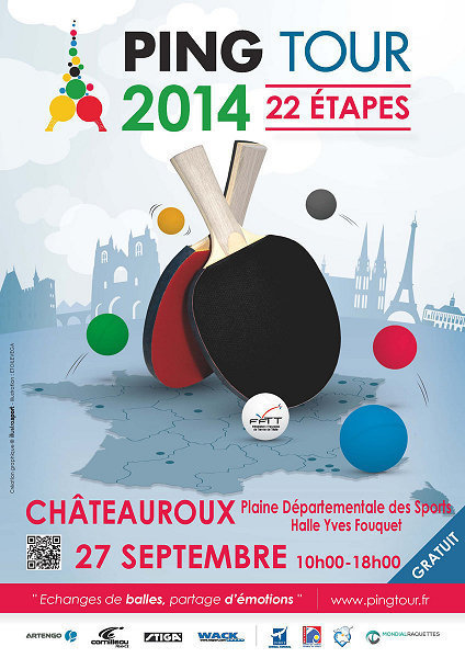 Le principe : Organisé pour la première fois l’an dernier dans le but de promouvoir les Championnats du Monde de Tennis de Table à Paris, le Ping Tour fait son grand retour dans 22 villes de France du 1er juin au 27 septembre 2014. L’espace d’une journée, le tennis de table s’invite dans un lieu emblématique. Une véritable arène où se succèdent et se croisent démonstrations, animations et initiations gratuites. Rendez-vous est pris à Châteauroux, le samedi 27 Septembre !