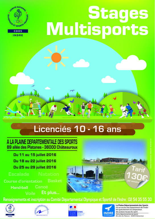 Le Comité Départemental Olympique et Sportif de l'Indre organise des Stages Multisports pour des jeunes âgés de 10 à 16 ans, qui auront lieu du 11 au 29 Juillet 2016,de 9h à 17h, à la Plaine Départementale des Sports (Mise à disposition gracieusement par le Conseil Départemental). Ces stages d'une semaine favoriseront la découverte de disciplines à la Plaine Départementale des Sports comme le Judo, Handball, Tennis, Course d’orientation, Cyclisme, Basket, Volley et Escalade